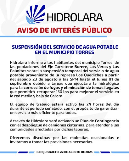 A través de un comunicado Hidrolara informó a todos los habitantes del municipio Torres, específicamente en las comunidades del eje carretero, Burere, Las Veras y Las Palmitas, sobre la suspensión temporal del servicio de agua potable proveniente de la represa Los Quediches.